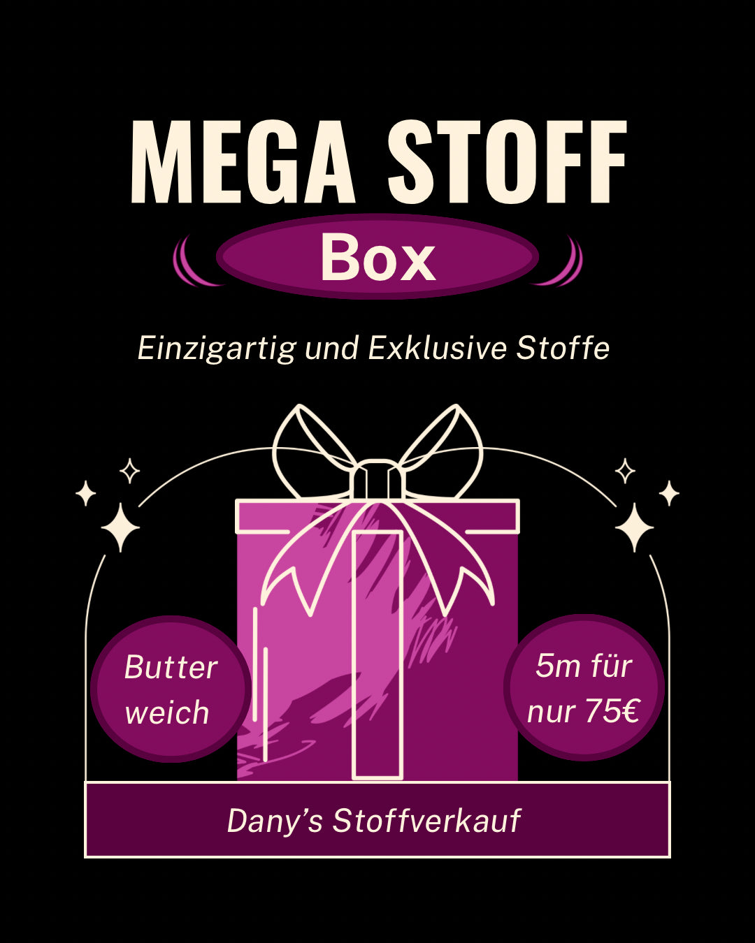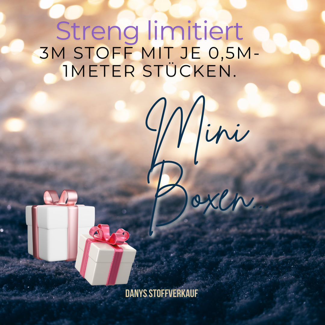 Ein wundervolles Jahr geht vorbei. Als kleines Dankeschön möchten wir euch eine mega tolle magische Box zum Schnäppchenpreis anbieten. In dieser Box gibt es tolle Eigenproduktionen sowie Unistoffe, Bündchen und viele tolle Stoffe vom Großhandel. Der Wert dieser Box liegt bei 120€, ihr zahlt jetzt nur 75€.